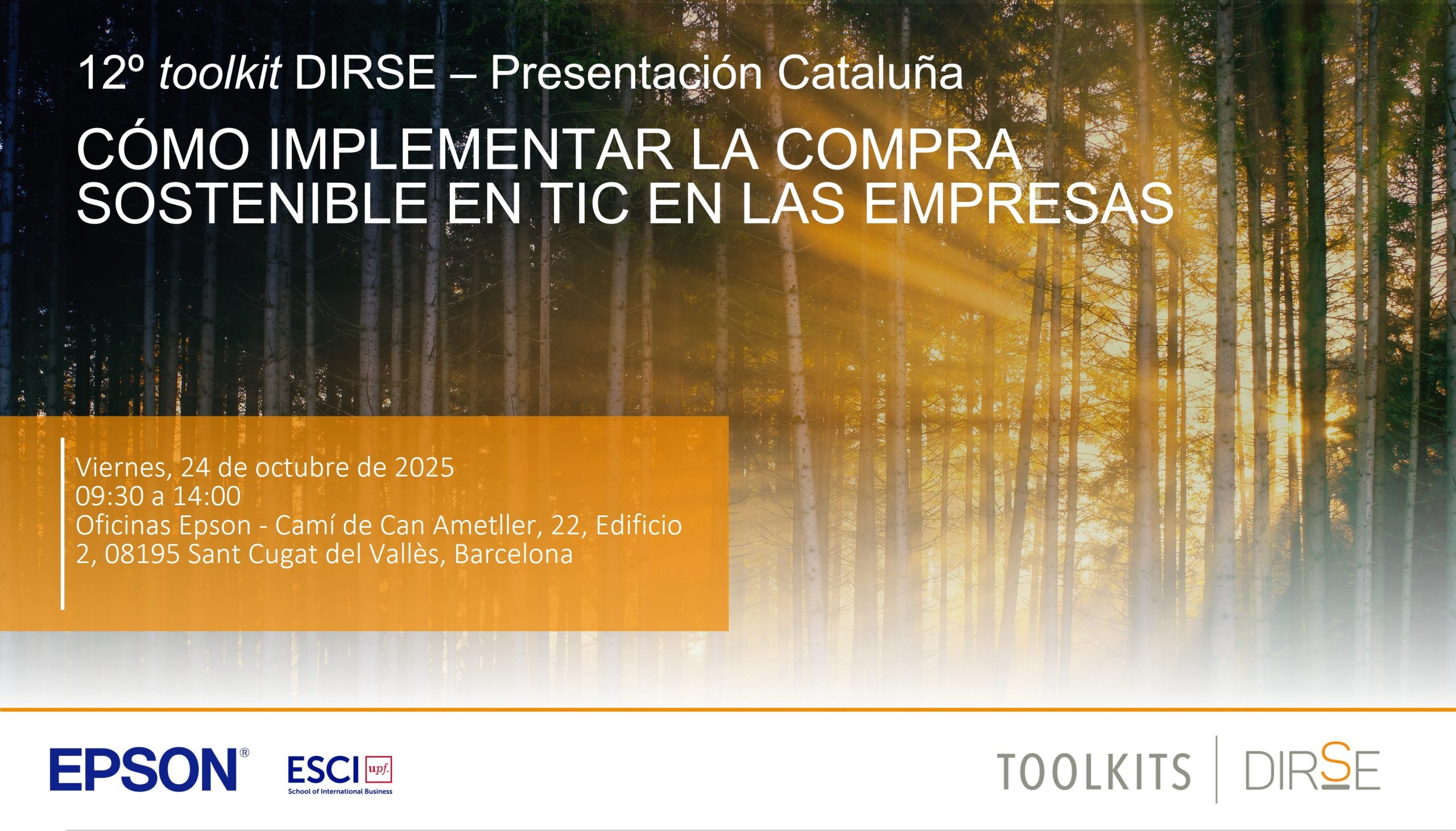 DIRSE presenta en Cataluña su 12º toolkit “Cómo implementar la compra sostenible en TIC en las empresas”, en colaboración con Epson y con el apoyo del Centro de Estudios de Buen Gobierno de ESCI-UPF (Universitat Pompeu Fabra). La jornada tendrá lugar el viernes 24 de octubre en Barcelona.
