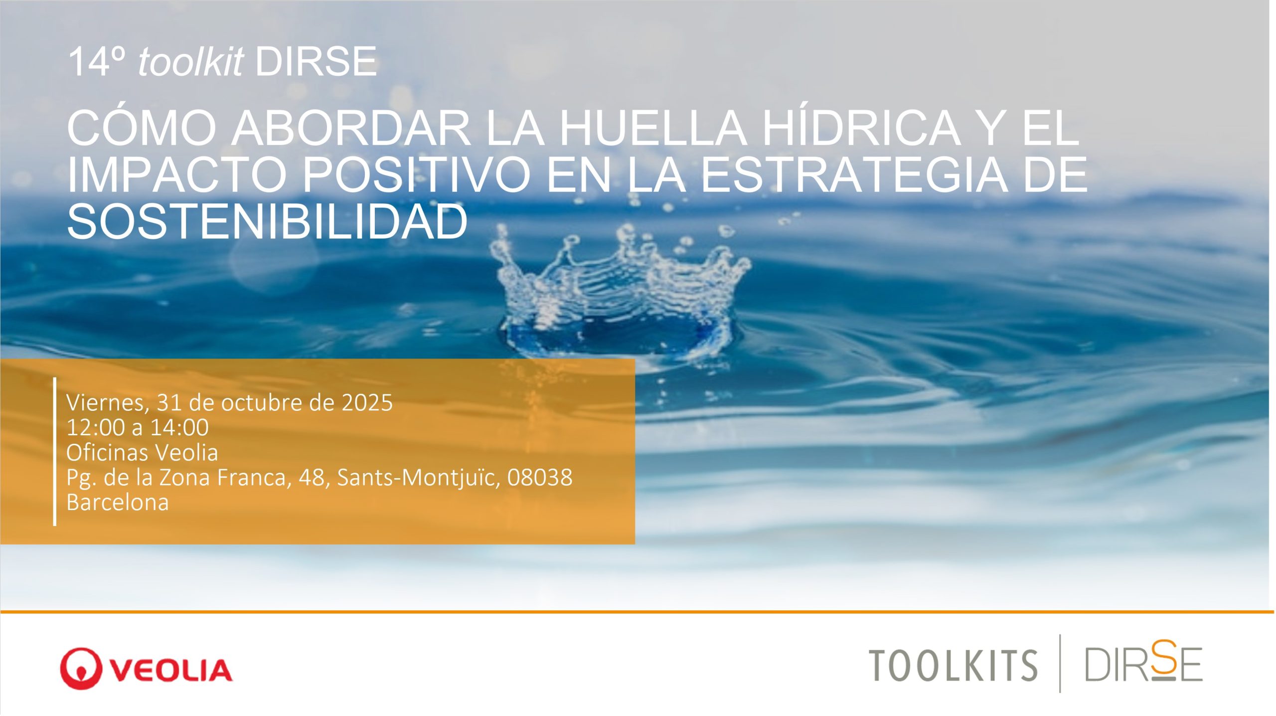 DIRSE presenta su 14º toolkit: “Cómo integrar la huella hídrica y el impacto positivo en la estrategia de sostenibilidad», en colaboración con Veolia. La jornada tendrá lugar el viernes 31 de octubre en Barcelona. Este evento ofrecerá la oportunidad de conocer casos reales recogidos en la guía y debatir sobre cómo integrar la sostenibilidad en un área clave para las organizaciones: la gestión del agua como recurso estratégico.