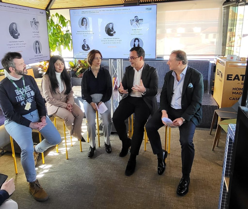 Durante el evento, una mesa redonda moderada por José Antonio Ezquerra Hernández, delegado de DIRSE en Aragón y gerente en Euskal Arido, reunió a expertos como Beatriz Alonso, directora de Sostenibilidad en Surus; Michele Aparicio, Business Consultant Spain & Portugal en Grupo Sylvestris; Ramón Gómez, Head of ESG en BNZ; y Gorka Rosell, director en SLEEP’N Atocha.