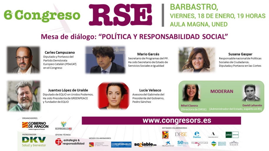 Nos referimos a Carles Campuzano, portavoz del Partido Democrático de Catalunya en el Congreso (y uno de los políticos con mayor trayectoria en el ámbito de la RSC, que desgraciadamente acaba de ser apartado de las listas de su partido); Mario Garcés, secretario de Programas del Partido Popular y en estas elecciones número uno por Huesca al Congreso de Diputados; Susana Gaspar, responsable nacional de Políticas Sociales de Ciudadanos; Juan Antonio López de Uralde, diputado por Unidas Podemos y fundador de EQUO (además de director durante 10 años de Greenpeace España) y Lucía Velasco, asesora del Presidente del Gobierno (que empezó en la RSC de la mano del propio Ramón Jáuregui).