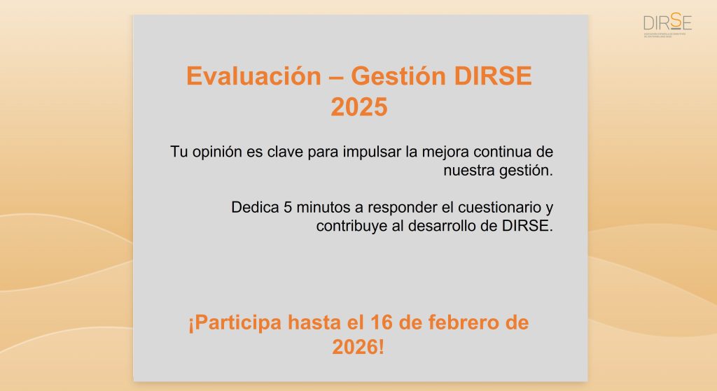 En DIRSE creemos que la mejora continua es un pilar esencial de nuestra gestión, y tu opinión es clave para seguir avanzando. Por eso te invitamos a participar en la Encuesta sobre la gestión de DIRSE en 2025, un breve cuestionario diseñado para recoger tus ideas, sugerencias y percepciones, que estará disponible hasta el 16 de febrero de 2026. Completarla te llevará menos de cinco minutos, pero su impacto será significativo para el futuro de la asociación.